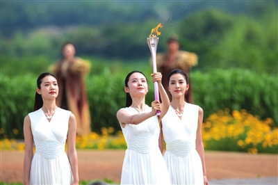 初夏的良渚古城遗址,潺潺流水、呦呦鹿鸣,在大自然声响谱写的原生态交响中,19名身着白色服饰的采火使者缓步登上台阶。“19”寓意第19届亚运会。采火使者手持采火棒,走向采火装置。装置中心是一面凹面镜,外圈采用良渚玉璧造型。采火使者将采火棒伸向采火装置,成功点燃采火棒。