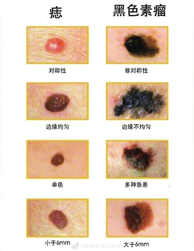 凡是有上述征兆者,应尽快到医院皮肤科或肿瘤专科就诊。确诊前不要随意在黑痣上敷药,更不能用针挑或轻率地切除。最后提醒大家,痣在长大的过程中若是伴随着颜色的变化、痣形状不规则以及身体出现异常现象,则要考虑是黑色素瘤,这时应该及时到医院进行检查。
