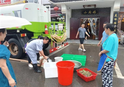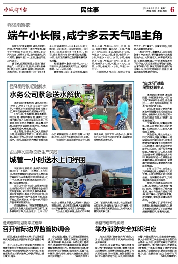 6月19日,受强降雨、雷电等影响,张公区域 、横沟桥镇区域、高新区工业园二期以及八斗角区域供水中断。为保证居民生活不受影响,自早晨8时起,思源水务紧急联系洒水车,为停水区域居民送水,解燃眉之急。