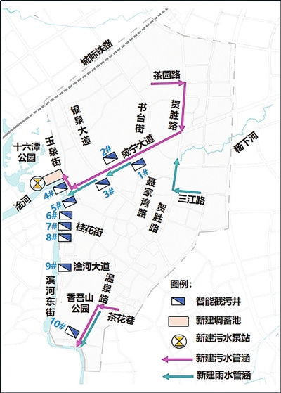 除了增加雨水管道、污水管道和对现有管道清理外,还将新建三大项内容。在咸宁大道东片区新建10座智能截污井,搭建智能排水平台;在淦河公园新建一处规模为6万立方米/日的桂花2#污水泵站,污水泵站下面就是溢流污染控制调蓄池;在咸宁大道新建电力排管,清理管涵内复杂管线。
