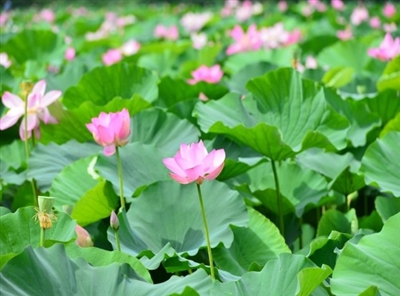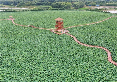 7月6日,记者在嘉鱼湖地野藕基地500余亩荷塘看到,荷花竞相绽放,形成一幅乡村美景图,吸引了不少游客和摄影爱好者来此观赏拍摄。
