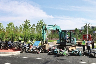 本报讯(记者 李思源 通讯员 李索)7月12日,在通城县银山广场,随着指挥员一声令下,一台大型拆解机高高举起铁臂,开始对成排的非法改装“炸街”摩托车进行碾压报废,直至摩托车辆完全损毁。