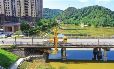 7月24日上午,咸宁城区双龙桥,桥梁检测工程车在桥面上运行,数名技术人员在桥梁下方进行桥梁检测工作。