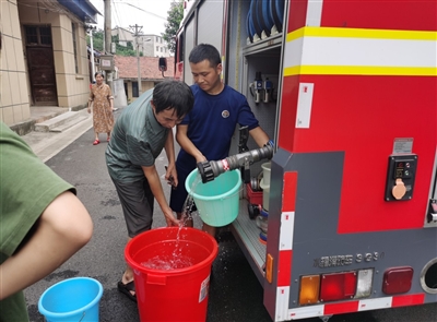 7月24日上午,南大街社区党委了解情况后,联系相关部门督促抢修进度,力争早日恢复小区用电。抢修期间,为了保障居民生活用水,社区与咸安区消防救援大队怀德路政府专职消防站取得联系,消防站迅速调派消防员和一辆消防车送水到小区,解决居民生活用水难题。在小区取水现场,消防队员一边引导居民排队,一边利用水枪帮助居民接水。居民们十分配合,纷纷为消防队员送水的举动点赞。