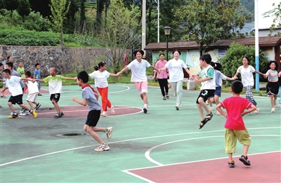 7月18日,通山县南林桥镇石门村文体小广场上,湖北大学“陌上花开”文化传承志愿服务队的志愿者们正在带领“希望家园”公益托管班的孩子玩“捕鱼”游戏。