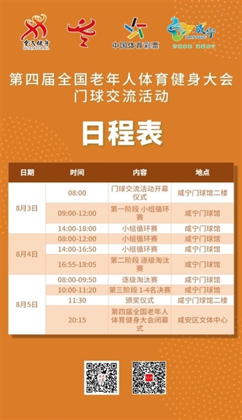 据介绍,第四届全国老健会设有14个比赛项目,分别在全国14个城市举行,其中门球交流活动在咸宁举行;同时,第四届全国老健会开幕式已于4月25日在四川泸州举行,闭幕式以及中老体协第七届会员大会将在咸宁举办。