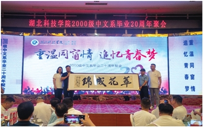 7月29日下午,湖北科技学院2000级中文系校友返校庆祝毕业二十周年活动在华信大酒店举行,湖北科技学院副校长钟儒刚、湖北科技学院统战部部长徐志清、社会合作与校友工作处处长陈洪国、武汉校友会秘书长毛先芝、原咸宁师专中文系系主任单长江、湖北科技学院人文与传媒学院党委书记杨纯新、湖北科技学院人文与传媒学院院长郭彧、湖北科技学院人文与传媒学院副院长何岳球、佘翠华、谭辉煌以及教师代表出席活动。