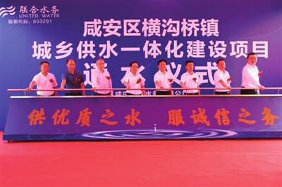 8月18日,咸安区横沟桥镇城乡供水一体化建设项目竣工暨通水仪式顺利举行。湖北省水利和湖泊厅农村饮水安全保障中心主任陈建华,湖北省王英水库管理局局长王文凯,咸宁市住房和城乡建设局党组书记、局长吴传清,咸宁市水利和湖泊局党组书记、局长郑耀英,咸宁市发改委党组成员、副主任吴伟生,咸宁高新区党工委委员、管委会副主任罗爱国,咸安区委书记顾兴旺,咸安区委副书记、区长李军平,咸安区人大常委会主任郑奇明,咸安区委常委、区委办公室主任万龙,咸安区政府副区长丁玲,江苏联合水务科技股份有限公司董事长兼总裁俞伟景、常务副总裁刘猛,以及区直相关单位、部分乡镇、村委会、项目建设单位等代表出席仪式,咸安区委常委、区政府常务副区长杜新国主持通水仪式。