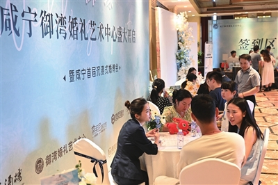 据咸宁市御湾酒店管理有限公司御湾酒店事业部总经理董煜介绍,御湾酒楼开业至今10年来,有超过3000对以上的新人在御湾酒楼举办了终生难忘的婚礼。面对越来越多的新生代新人,对婚庆的规模、场景等有了更高的需求,为此,御湾酒店公司斥巨资对御湾酒楼、御湾-合宴酒楼宴会场地进行主题改造,引入时下最流行的主题婚宴场景,建造出4个声、光、电、影极致体验的沉浸式、“一站式”主题婚礼堂。为提升婚礼服务品质,成立咸宁御湾婚礼艺术中心,推出“一站式”婚礼采购,筛选与婚礼和喜宴相依靠的一线品牌商家组成联盟,参加本次婚博会。新人们无论是找婚车,拍婚纱照、找主持人、找婚庆公司、布置场地、挑选伴手礼、买酒水等,都可以在这里进行“一站式”找到你需要的商家,实现婚礼“一站式”“一套龙”服务,让准新人及家属从各种繁琐的“细枝末节”里解脱出来,轻松办好婚礼。