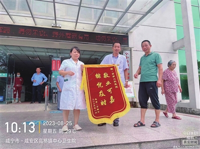 本报讯(通讯员 王文清)8月25日,咸安区高桥镇澄水洞村村民万家干的家属给高桥镇卫生院送来“敬业可嘉,排忧及时”的锦旗,以表达对该院医务人员的感激之情。