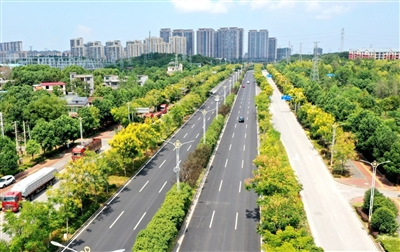 9月18日,无人机镜头下的东外环公路两旁,栾树已进入花期。金黄色的栾花、红色的果实和绿叶交相辉映,仿佛一幅流金溢彩的画卷,形成了一道靓丽的城市风景线。(记者 陈红菊 王奇峰)