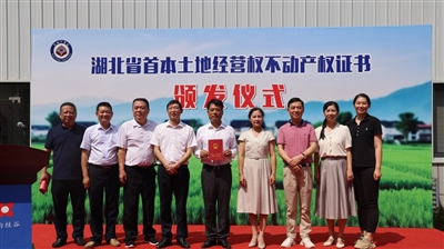 9月19日上午,湖北省首本农村土地经营权不动产权证书颁发仪式在咸宁市咸安区贺胜桥镇万秀村举行,标志着咸安区不动产统一登记进入新阶段,农村土地“三权分置”改革迈出重要一步。