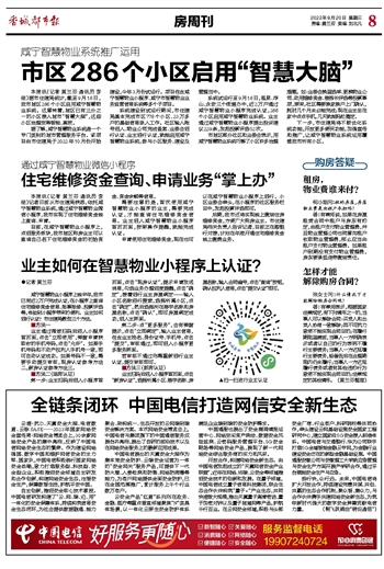 本报讯(记者 黄兰芬 通讯员 李俊)据市住建局统计,截至9月18日,我市城区286个小区启用咸宁智慧物业系统。这意味着,城区已有三分之一的小区接入城市“智慧大脑”,这些小区治理变得智能、高效。