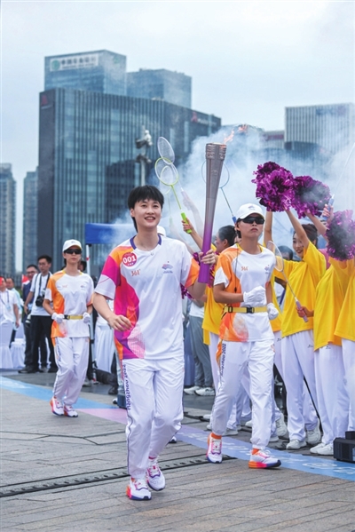 本报综合消息 奔流不息的钱塘江畔,亚运“薪火”汇聚点点光芒。20日,杭州第19届亚洲运动会火炬传递杭州站起跑仪式在杭州城市阳台举行,奥运冠军、羽毛球运动员陈雨菲在欢呼与助威声中,开始火炬传递。