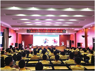 为加强校园安全教育,增强学生的法治观念,杜绝校园欺凌事件的发生,提高学生的安全防范意识和自我保护能力,9月22日晚,咸安区永安中学联合咸安公安分局,开展了以“拒绝校园欺凌,守护少年的你”为主题的法治知识讲座,进一步构建安全、和谐、文明的校园环境,该校150余名学生聆听讲座。