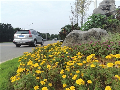 昨日上午,记者在通江大道两侧绿化带内看到,造型独特的山石、绿意盎然的草坪、紫娇花、美女樱、万寿菊等时令花卉点缀其间,形成了一处处独特的园林景观。