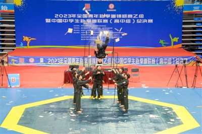 10月10日上午,赤壁市体育中心隆重举行“赤壁青砖茶杯”2023年全国青年跆拳道锦标赛乙组暨中国中学生跆拳道联赛(高中组)总决赛开幕式。来自全国各地62支代表队、近400名运动员参与角逐。