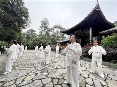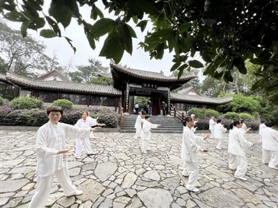 潜山做舞台,桂花为背景。近日,市区潜山国家森林公园,数十名太极爱好者齐聚在桂花博览馆门前,传播太极健身文化,倡导文明健康的生活方式。 (记者张仰强)