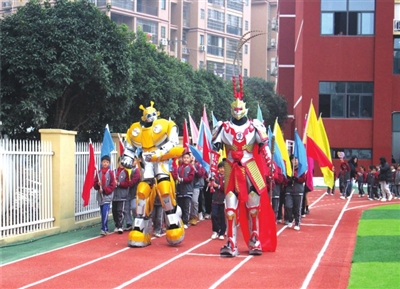 当日上午8点半,伴随着运动员进行曲,各班级方阵整齐有序地走进赛场,他们昂首阔步,尽显中华少年的豪情壮志,而变形金刚的惊喜出现,更是瞬间点燃了在场师生的热情。开幕式上,全体师生共同参加升旗仪式。咸宁市第七小学校长朱海涛在开幕词中,希望全体师生“每天锻炼一小时,健康工作五十年,幸福生活一辈子”,勉励全体师生在本次运动会上赛出水平,赛出风格,并预祝运动会取得圆满成功。