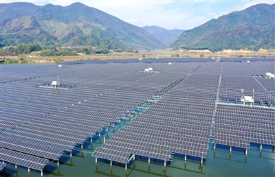 11月14日,通山县九宫山镇富有村“渔光互补”光伏项目基地,水域上矗立着一排排光伏电池板,蔚为壮观。