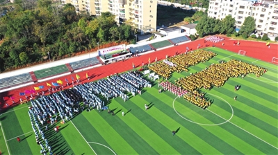 “鲲鹏一日同风起,扶摇直上九万里。”此次运动会开幕式最大的亮点是,每个班的学生方阵百花齐放,争奇斗艳,他们或歌或舞、或朗诵或打拳舞剑,将竞技、舞蹈、中华传统武术等元素融为一体,以不同的艺术表演形式,来表达对运动会开幕的喜悦,你瞧,九(一)班同学的剑舞,动作刚劲有力,翩若惊鸿,婉若游龙,一招一式尽显中华传统武术魅力,与操场上手持小红旗的孩子们交相辉映,那一张张朝气蓬勃的笑脸下面,火热跳动的是一颗颗“中国心”。孩子们出色的表演,充分展现了该校“以生为本”,全面推进“德智体美劳”五育并举、五育融通的育人模式。整场运动会开幕式,立体呈现出人文之美与运动之美,凝聚了以体育德的强大动能,同心共绘全面发展的生动画卷。