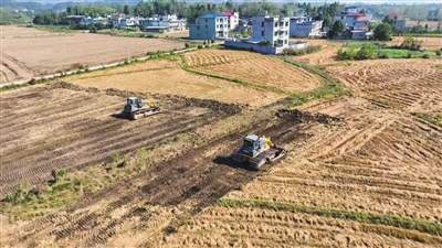 11月2日,崇阳县白霓镇三溪村高标准农田建设现场,挖掘机、推土机轰鸣作响,工程车来回穿梭,一派热火朝天的忙碌景象。据介绍,三溪村高标准农田建设面积800亩,总投资300多万元,将土地平整379亩,衬砌渠道20940米。