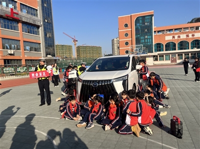 “这就是车辆盲区造成的!”交警顺势引导学生们认知盲区带来的危险,玩耍时要远离车辆。