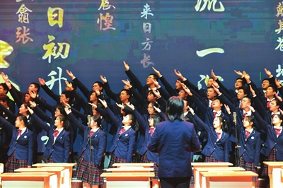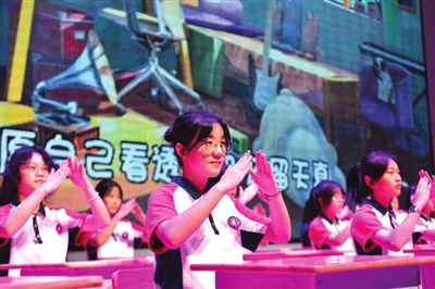 《少年中国说》的合唱,动作整齐划一,声音浑厚响彻舞台,诗言志歌咏言,气势磅礴的演出展示了青年学生胸怀天下的豪情;高二年级的优秀课桌舞表演,模拟教室学习的情景,以书本为道具,灵动的表演,展现了学生们朝气蓬勃,奋发向上的精神面貌。