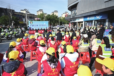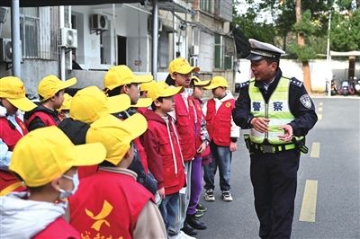 学习源于实践并指导实践。学习交通安全知识之后,交警们分组带领小记者走上街头,体验交通劝导员。在长安大道一处红绿灯路口,四条斑马线,每处出入口两侧分列站着身着红马甲的小记者。