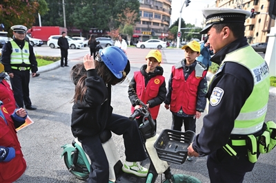 “那个电动车后座的奶奶没戴头盔,我可以过去劝说吗?”刚刚到达斑马线,还没来得及分工,小记者明小天发现一处不戴头盔的乘车行为,立即向交警报告。得到肯定后,交警陪同明小天一起劝导,礼貌问好之后,他说:“您乘坐电动车也需要戴头盔。”对方听说之后,连连夸赞小记者劝导礼貌,并欣然接受建议。随即,奶奶下车步行而去。