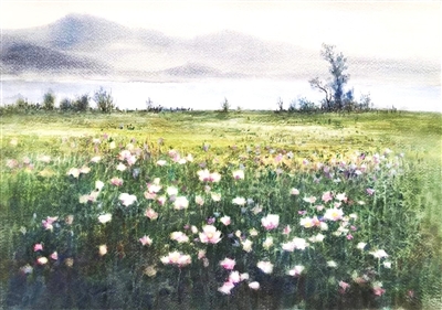 水彩画《湖边的风景》