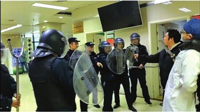 演练中,急诊科闯进两名“手持凶器的男子”,他们情绪激动地将正在坐诊的医生劫持,值班护士见状立即通过一键式报警设备向110指挥中心报警,正在急诊值守的保安人员立即呼叫医院监控中心,由医院监控中心通知医院特勤队携带防暴器材(盾牌、钢叉、警棍、脚叉)紧急赶到医院急诊大厅,展开解救工作。其他队员则立即拉开警戒线,疏散周围群众。经过一番劝导,趁着持刀男子注意力分散,被劫持工作人员趁机逃脱,保卫科特勤防暴队及赶来的民警迅速包围上去,用钢叉,脚叉、警棍将两名持刀男子制服,带上手铐,压上警车,演练至此结束。