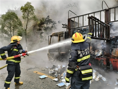 救援现场,货车正处于猛烈燃烧状态,火势非常大,着火点离油箱非常近,情况十分紧急。指挥员立即分两组救援,一组对相关路段实施封闭警戒,另一组则分别在车头和侧面各出两支水枪进行扑救。