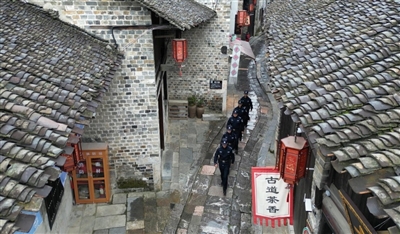 近日,记者在赤壁市羊楼洞景区内看到,赤壁市赵李桥派出所民警排成整齐的队伍,穿梭在景区内,守护游客安全。