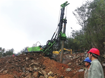咸宁供电公司丰源电业接下这个任务。铁塔施工,够深够实的坑基是关键。赤铜线超过三分之一线路部分,都布满了这种坚硬的山石。以往施工中遇到这些硬货时,要么无奈绕过重新选址,要么加大坑基直径,增加造价和时间成本,但这次,吴钢拿出一个“秘密武器”——电建钻机。