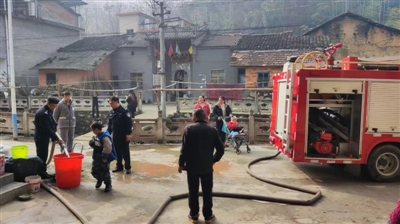 原来,毛坪村因雨水较少,地下水位下降,自掘井枯竭,导致村民生活用水严重受阻。正当村民因用水问题而发愁时,桂花派出所民辅警当起了义务跑腿的“送水工”,开着消防水车为居民送水。当天,民辅警为毛坪村20余户村民送水约4吨,及时解决了村民生活用水所需。