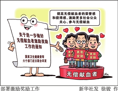 新华网消息 记者8日从国家卫生健康委获悉,国家卫生健康委、中央宣传部、全国总工会等六个部门近日联合印发《关于进一步做好无偿献血者激励奖励工作的通知》,要求各地有关单位提高无偿献血者的荣誉感和获得感,激励更多社会公众关心、参与无偿献血。