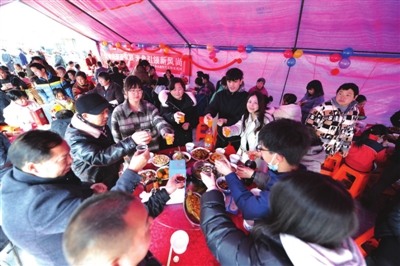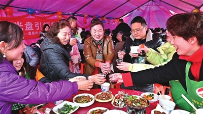 上午11时30分,在热闹的锣鼓声中,百家宴正式开席。一碗碗热腾腾、香喷喷的菜陆续上桌,你端上一盘色香味俱全的锅巴肉、我端上一份香辣可口的沸腾鱼……不一会儿,20桌席位就被各色菜肴摆得满满当当。有的居民吃腻了自家的手艺,就将自己做的拿手菜端到邻桌,彼此交换菜肴,互换口味的同时交流烹饪经验。