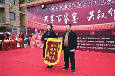 心系居民,情暖万家。1月16日,在百家宴活动现场,中亨尊品小区物业公司——咸宁佳隆物业有限责任公司法人雷宗伟,将一面锦旗送给了咸安区温泉街道金叶社区。
