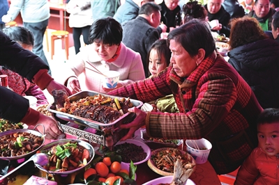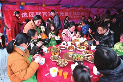 “开席啦!”“开席啦!”中午12时,10名身穿绿色围裙的“宝妈”挨个端着热气腾腾的“佳肴”放在宴席上,摆成温馨的百家宴,每桌10个菜,代表着团团圆圆。