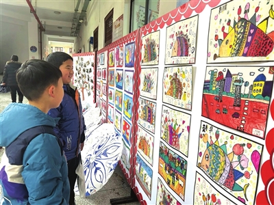 本报讯(记者熊大平 通讯员陈卫红)“看,这是我的画……”1月19日上午,咸宁实验外国语学校玉泉校区养正楼一楼走廊,一排排画展前,103班的学生纷纷围观各自的作品,同学们脸上洋溢着开心的笑容。这一天是学校发放素质报告册的日子,也是玉泉校区四个特色班“一班一品”集中展示的时间。