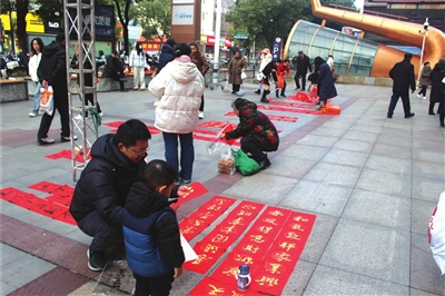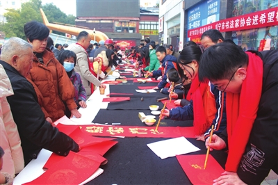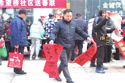 “一年四季行好运 八方财宝进家门”“一帆风顺吉星到 万事如意福临门”“福旺财旺运气旺 家兴人兴事业兴”……活动现场,大小书法家们还贴心地为居民们准备了对联手册,供大家挑选,他们个个热情高涨,铺纸研磨,挥毫泼墨,在红彤彤的纸上一笔一划专注地写下居民们所挑中的对联,不多时,一个个遒劲有力的"福"字跃然纸上,一副副喜庆吉祥的春联翰墨飘香,闪耀着中华优秀传统文化的智慧光芒,吸引了众多居民关注,他们纷纷驻足围观,时而点头称赞,时而低头微笑,对书法作品赞不绝口,记者在现场看到,有的居民在为自己精心挑选对联的同时,还不忘掏出手机通知亲友前来领取对联,分享快乐。