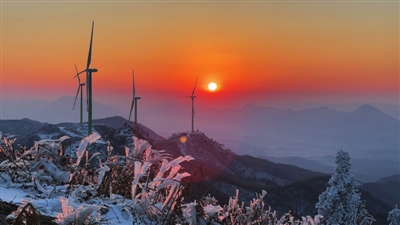 近日,受强冷空气影响,我市迎来2024年第一场降雪。1月24日上午,在通山县大幕山冬瓜大包,皑皑白雪将山峦与林海妆点成缥缈仙境,随着一轮红日从东方冉冉升起,倾泻的霞光又为雾凇云海增添了炫目的震撼之美。(记者陈婧 通讯员阿树)