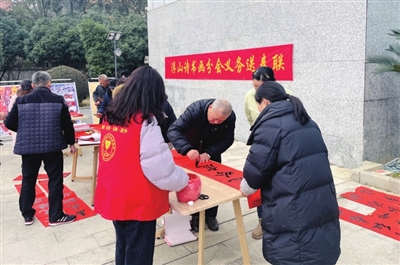 本报讯(通讯员 张文昆 袁佳丽)为弘扬传统文化,营造喜庆的节日氛围,1月30日,咸安区浮山街道办事处、机关老年党支部、咸安区老年书画家协会浮山分会联合浮山街道新时代文明实践所在街道前广场举办“非遗过大年 福暖万家迎新春”写春联活动。