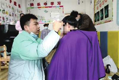 “丹妹子”修剪完了,“靓仔”来了,紧接着,“一哥”也在一旁排起队……理发时,有的孩子还小,便由保育员抱在怀里,王金水和徐立志需要蹲着甚至半跪着修剪。记者留意到,王金水和徐立志对每个孩子都非常熟悉,不仅能准确叫出他们的名字,对他们的喜好也十分清楚。