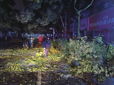 为避免树木承载积冰过重造成枝条断裂影响交通、砸伤行人和车辆,影响道路通行造成拥堵,嘉鱼县城管执法大队连夜紧急出动突击队员30余人次配合园林、环卫工作人员,对倒伏树木、断枝进行清理。