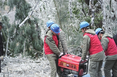 2月6日,因雨雪冰冻天气,通城药姑山居民用电受到影响,国网咸宁供电公司紧急送发电机,恢复供电。 (通讯员 杨微微)