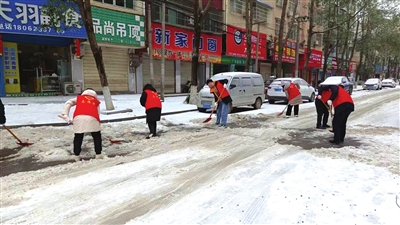 面对大雪冻雨天气,团市委启动志愿服务应急机制,组织各级团组织动员1200余名青年志愿者就近就便参与社区、街巷、便道等区域除雪除冰;主动参与交通路口值守疏导,维护安全交通秩序;为因雪滞留车内乘客送餐送水,助力营造安全、便捷的出行环境。