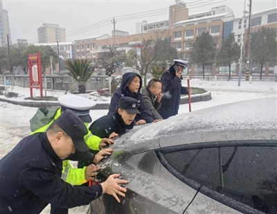 一时间,路面上,民辅警纷纷变身“扫雪工”“破冰者”“推车侠”,“闪现”临近各大街道路口,手持铁锹、扫把铲冰除雪,救援保畅。