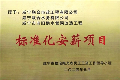 近日,经咸宁市根治拖欠农民工工资工作领导小组严格考核,由咸宁联合水务有限公司建设、咸宁联合市政工程有限公司施工的“咸宁市城区老旧供水管网改造工程”荣获咸宁市第四批“标准化安薪项目”荣誉称号,并颁发牌匾。